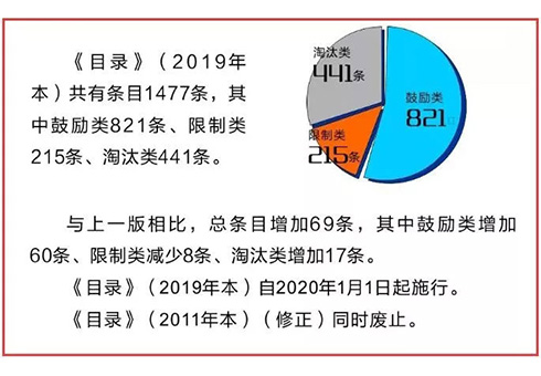 11月6日,国家发改委网站公布了《产业结构调整指导目录(2019年本》(目录(2019年本)),自2020年1月1日起施行。 目录(2019年本)共涉及行业48个,条目1477条,其中鼓励类821条、限制类215条、淘汰类441条。不属于以上三类,且符合国家有关法律、法规和政策规定的为允许类,不列入《目录》。